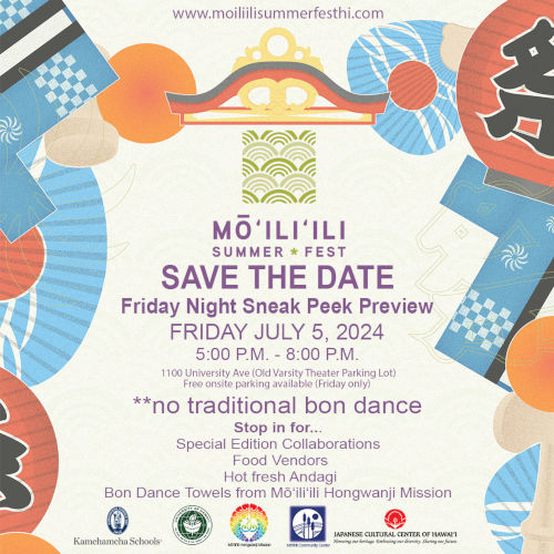 Our annual Bon Dance & the 11th Annual Mō‘ili‘ili Summer Fest is quickly approaching. Please save the dates! Mō‘ili‘ili Summer Fest will be having a Sneak Peek Preview event on Friday, July 5, 2024 from 5:00pm – 8:00pm (same location as the Mō‘ili‘ili Summer Fest). It is an opportunity for attendees to stop by for special edition collaboration merchandise from local businesses and purchase various foods such as Andagi (Okinawan donuts) and Flying Saucers (a Kauai specialty).