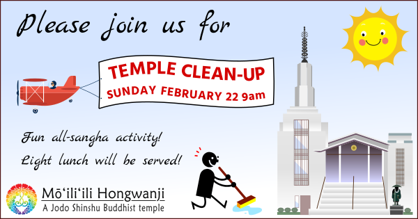 This Sunday, February 22, is Temple Clean-up, a fun all-sangha activity. Please kokua. There will be a short service in the downstairs annex by Rev. Fujimoto at 9:00 a.m. A light lunch will be served.